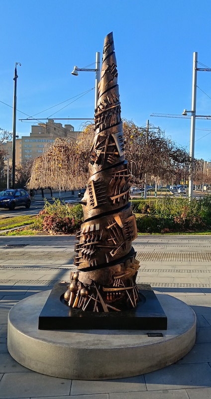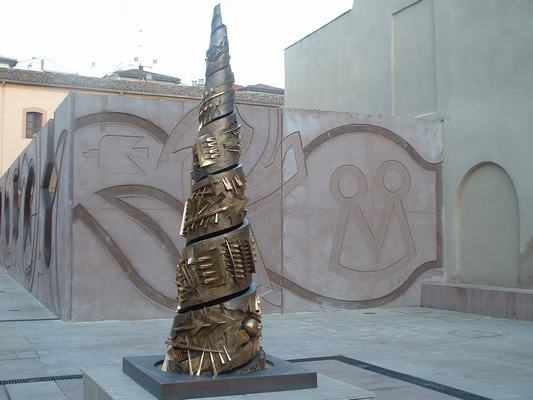 Se trata de una pieza cónica, que podríamos calificar de atípica en la trayectoria de Pomodoro, más conocido por sus esferas, pero que recurre también al prisma, al cilindro, al hexaedro o al cono.