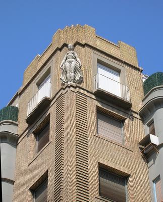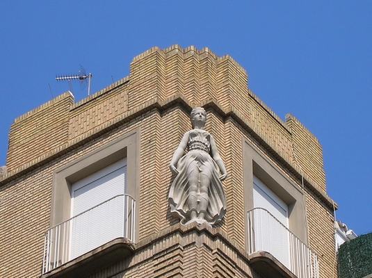 El ejemplo aquí comentado es una representación alegórica de la brisa en forma de figura femenina, ubicada en el último piso del chaflán de la vivienda de Zumalacárregui, número 4, donde que se acomoda e integra a la perfección. Representada en pie, con la cabeza al frente y los brazos abiertos, la vemos definida en un clasicismo correcto, ataviada con una túnica a la manera de peplo griego, de suave tejido y ceñida en la cintura, la cual, bajo los efectos de la suave brisa que la invade, se ajusta al cuerpo de la mujer revelando una sensual anatomía con una técnica similar a los paños mojados de la antigua Grecia. Salvando las lógicas distancias, nos recuerda a la Victoria de Samotracia que, ubicada en lo alto de la proa de un navío y envuelta en un fino chiton azotado por el viento y el agua, exhibe una bella anatomía envuelta en los paños mojados más famosos de la Historia del Arte.