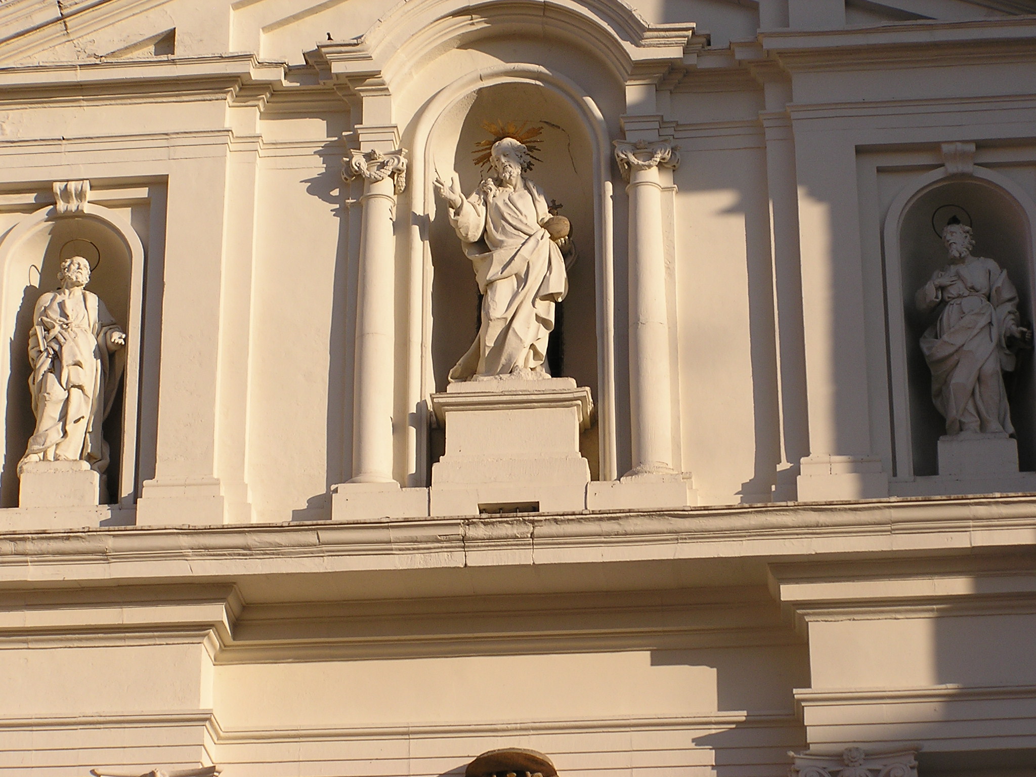 2.- Puerta principal: en el costado oeste, hacia la plaza de la Seo las estatuas del Salvador y a los lados, de san Pedro y san Pablo, realizadas porManuel Giral Martínez hacia 1870 por encargo del arzobispo Francisco Ignacio de Añoa y Busto (1744-1764).Las tres esculturas se ubican en hornacinas en el segundo cuerpo de esta portada neoclásica, articulada con cuatro columnas en el inferior y rematada por un frontón. Dicha portada es obra del arquitecto Julián Yarza que, al parecer, siguió el proyecto de una puerta diseñada por Ventura Rodríguez para el tempo del Pilar, que no se realizó. Fueron revestidas de blanco la portada y las estatuas, como estuvieron originalmente, durante la restauración de 1987-1992. Sobre la puerta, escudo arzobispal en relieve de piedra y dorado.