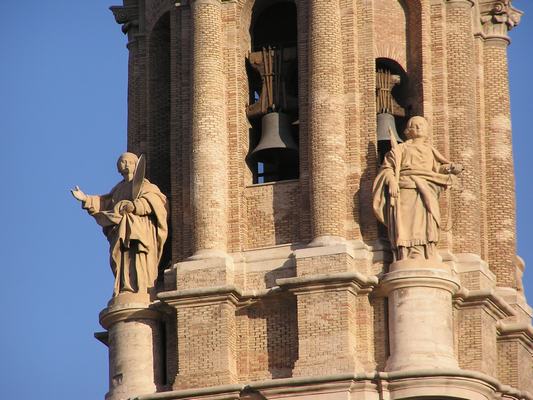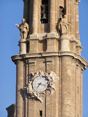 Esculturas en piedra caliza blanca obra deJoaquín Arali, por encargo del arzobispo Agustín de Lezo y Palomeque (1784-1796).En las esquinas delarranque del tercer cuerpo, están las estatuas de las cuatro virtudes cardinales (Prudencia, Justicia, Fortaleza y Templanza), de tamaño mayor que el natural.En el segundo cuerpo, reloj monumental sostenido por las estatuas del Tiempo y la Vigilancia.