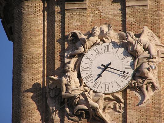 - En el primer cuerpo de la torre campanario hay una gran lápida con inscripción conmemorativa en latín de la realización de la obra escultórica en letras capitales: D.O.M. TEMPLI SERVATORIS TURRIM AD. POPVL. CHRISTIANVM AD. RELIG. SOLEMNIA PERAGENDA CONVOCANDVM ERECTAM A JOAN BAPT. CONTINI ROMAE INGENIOSE INVENTAM C.C.Q.VV. CAROLO REINALDI S.P.Q.R. CAROLO ITEM FONTAM SAC. PALAT. APOST. ARCHITECTIS VEHEMENTER PROBATAM A PET. CVIEV. GASP. SERRANO JACOBO BORBONIO HISPANIS AN DNI MDCLXXXVI AFFABRE EXTRVCTAM S JOACH DEMVM ARALI CAES AVGVST. STATVIS MAGNIFICE EXORNATAM COLLEG. CANONICOR CAESAR AVGVSTNVM AN DNI MDCCLXXXX PIO VI PONTIFICE MAXIMO CAROLO IV BORBON HISP. REGE AVGVSTINO DE LEZO ANTISTITE RELIG ERGO C