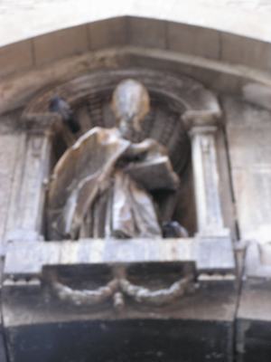 De las tres portadas, la meridional o de la Pabostría, tiene una pequeña escultura encima del arco que representa a San Agustín con sus atributos habituales de la mitra, como obispo, y una pequeña iglesia sobre un libro abierto, como fundador. En la portada principal u occidental, es la estatua del Salvador la que la preside con el símbolo del orbe en la mano y los santos Pedro y Pablo, con las llaves y la espada, respectivamente.