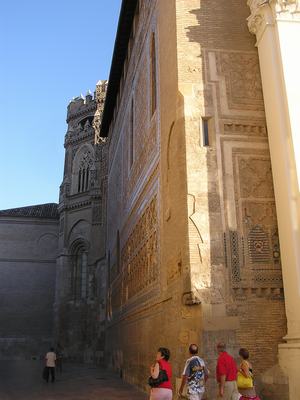 La catedral de La Seo presenta la singularidad de tener tres puertas de acceso (al oeste o principal, al este y al sur) y una fachada que es la de mayor interés visual y artístico de todo el monumento, que no se corresponde con ninguna de estas tres portadas. Se trata de la fachada septentrional, configurada por dos de los tres ábsides románicos (el de la epístola fue suprimido cuando se construyó la sacristía mayor), construidos en piedra sillar, que se remataron en ladrillo en estilo gótico. A su costado, se decoró en 1378 el muro de la capilla de San Miguel, o Parroquieta,con azulejos de formas geométricas y la media luna del escudo del arzobispo don Lope Fernández de Luna. Completaba la perspectiva y cierre de la recoleta placeta de la Seo el paso elevado sobre un arco rebajado, del siglo XVIII, que comunicaba el palacio arzobispal con la catedral atravesando un extremo de esta fachada. Fue suprimido de modo innecesario en la década de 1970.