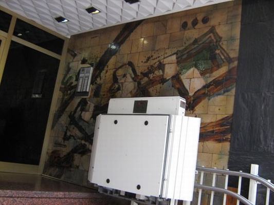 - Dos murales que dan a la calle, uno frente al otro, de 3'50 x 5'20 metros cada uno aproximadamente. En el interior del portal hay cuatro maceteros en forma de cubo con tres cuerpos cada uno, obra de Andrés Galdeano, sujetados por una base de hierro.