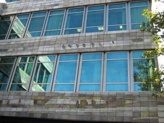 El magnífico mural, configurado por tres frisos paralelos, está realizado por cerámicas rectangulares paralelas a la base. Todo, en el aspecto formal y cromático, obedece al mismo criterio para evitar cualquier fallo. Predominan los colores pálidos, sobre todo grisáceos, para eludir cualquier matiz exclamativo, entre los que destacan algunos verdosos y suaves amarillos, como norma ubicados en zonas muy dispares y con escasa profusión. El color blanco original se ha diluido con el tiempo. La falsa monotonía abstracta se rompe mediante formas ovaladas, cuadrados, rectángulos y pequeñas incisiones de muy variados tamaños, sin olvidar los trazos largos, con un punto agresivo, que transcurren paralelos a la base. Todo lo indicado para ofrecer una amplia variedad formal y cambiantes matices móviles. La proliferación geométrica, y otras formas, no parece encerrar un carácter simbólico, pues aquí se trata de un eficaz recurso para romper la inexistente monotonía de tres largos frisos.