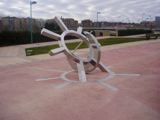 Así, la representación de estos dos astros, que se disponen afrontados, montados uno sobre el otro con una inclinación opuesta y unidos por su parte inferior, conforma la estructura fundamental de la pieza, que se completa por una barra que se dispone entre los dos extremos de la media luna y que sirve, gracias a la incidencia solar, para la proyección de sombras sobre el dial horario en relieve incluido en la cara interior de la parte inferior del anillo solar, y por ende para calcular la hora. A su vez, una silueta del propio anillo solar, incluidos sus siete rayos o proyecciones, realizada también en acero inoxidable, aparece inserta en el suelo de hormigón rojizo sobre el que se asienta la obra, lo que genera una suerte de dualidad visual con la propia pieza, que resulta muy efectista y lograda, aportándole mayor presencia.