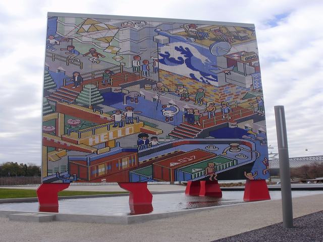 El mural se inspira claramente en la estética de los videojuegos de la primera mitad de los años 90 del siglo XX, y posee un gran efectismo, tanto por su rico colorido, como por su complejidad compositiva, sentido narrativo, abundancia de figuras y edificios, pero sobre todo por su concepción naif y esquemática de los distintos elementos representados, especialmente los personajes, estética muy particular que conecta muy bien con el espectador, especialmente con el público infantil. Por su parte, los bordes perimetrales y la zona posterior del gran soporte en que se fija el mural se recubren con baldosas de gres de color gris claro que se combinan con seis soportes cuadrangulares de diferentes formatos (y dos pequeñas jardineras) de los que penden plantas tapizantes y colgantes, lo que sirve para fragmentar y aligerar su masiva presencia visual, algo que se logra con eficacia.