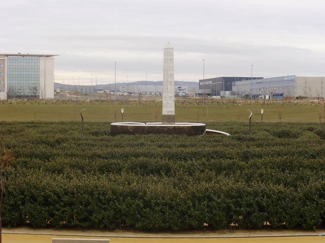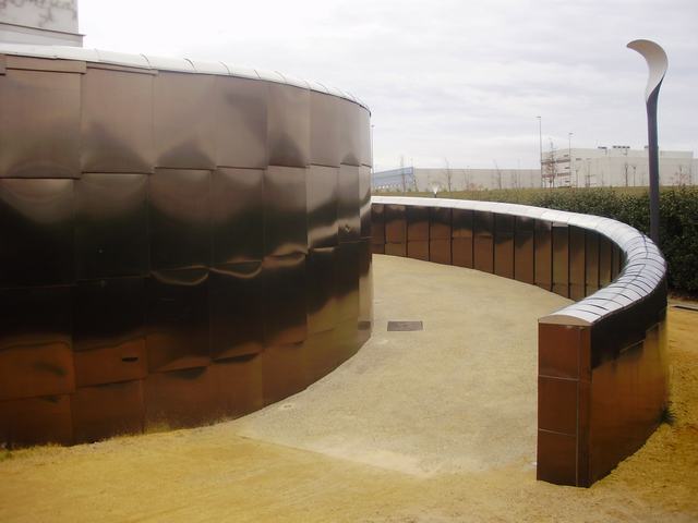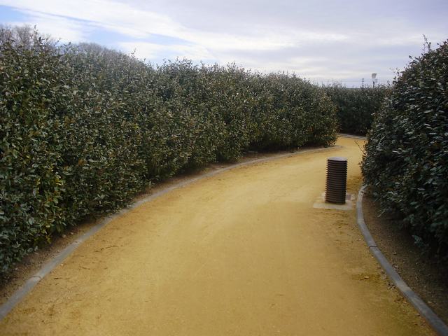 - Arbusto elaeagnus ebbingei (seto), acero inoxidable (recubrimiento del último tramo del laberinto y base del obelisco), tinte marrón cobrizo (capa protectora del acero inoxidable del último tramo del laberinto), alabastro (obelisco).
