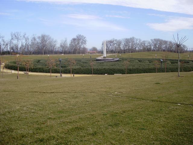 Los aspectos que dan singularidad a este laberinto son dos: 1) el hecho de que la mayor parte del recorrido del mismo, pseudohelicoidal, esté flanqueado y delimitado por un seto natural de gran porte y belleza; y 2) que la zona central del laberinto esté presidida por un último tramo acabado con un recubrimiento de láminas muy brillantes de acero inoxidable tintado en color marrón cobrizo, que queda coronado en su centro por un monumental obelisco hueco de alabastro, que al ser translúcido, por la noche se puede iluminar desde el interior siguiendo una secuencia de seis colores que cambian cada media hora.