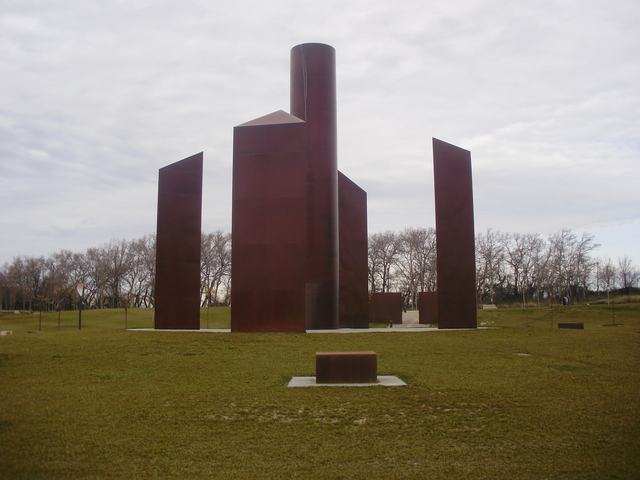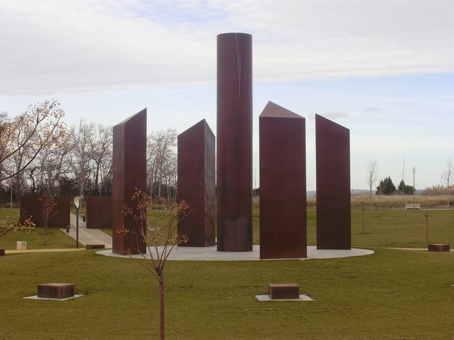 - Acero corten oxidado (las piezas), barniz protector (recubrimiento de las piezas), hormigón (plataforma circular en torno al cilindro y los cuatro prismas de base triangular), cesped (entorno).