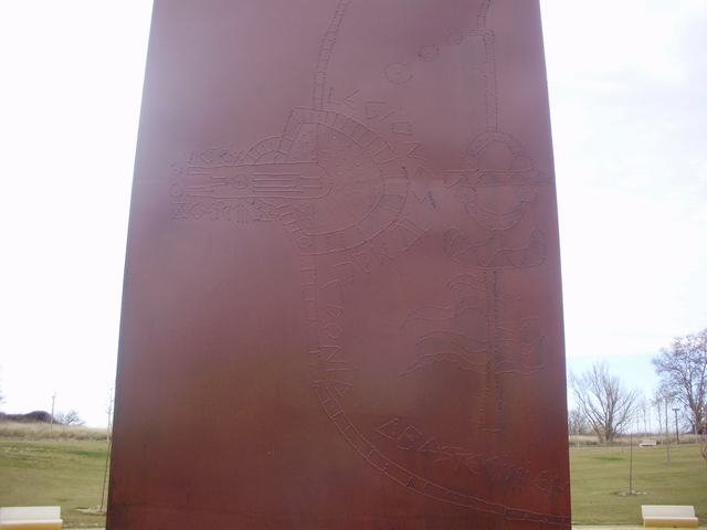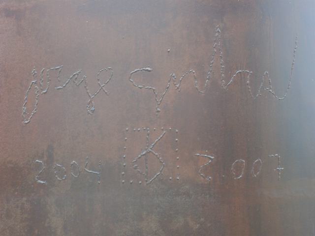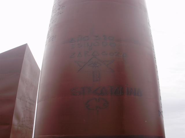 - 1) en la superficie del gran cilindro central y de los cuatro prismas de base triangular que lo rodean, existen numerosísimos grafismos realizados con marcas de soldadura, totalmente inconexos, que aluden a hitos históricos, fechas, personajes y lugares relacionados con Zaragoza y vinculados con cada una de las cinco culturas que se han desarrollado en la ciudad a lo largo de su Historia. Por ejemplo, en el prisma correspondiente a la cultura judía, aparecen inscripciones como: 1273 / ABINBRUC / APELLIDO / SARAGOSI / 839 BODO / ELEAZAR / JEHUDÁ / DE LA / CABALLERÍA / 1347 / JEHUDÁ LEHA / ... ; 2) en la parte baja del cilindro central, realizado con marcas de soldadura: JORGE GIRBAU / 2004-2007.