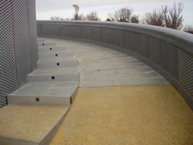 - Altura total: 13'60 m.; diámetro en la base: 21 m.; superficie construida: 364'85 m²; rampa-escalera de acceso: 96'60 m. de longitud.