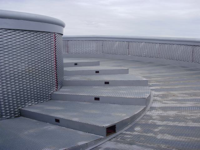- Acero (estructura interior), pintura roja (recubrimiento protector de la estructura interior), chapa de acero perforada, estirada y lacada (forro general de la pieza, que cubre la estructura constituyendo su imagen exterior).