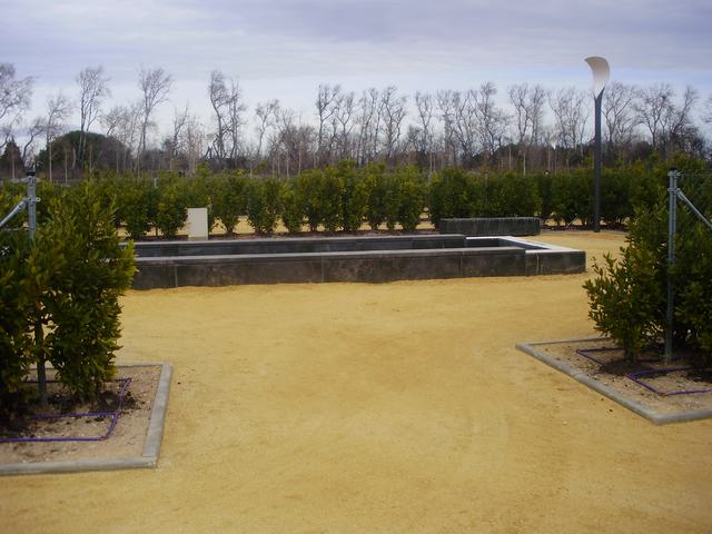 - Laurel (seto), albero (caminos), hormigón (estructura de la alberca), piedra negra de Calatorao (recubrimiento de la alberca).
