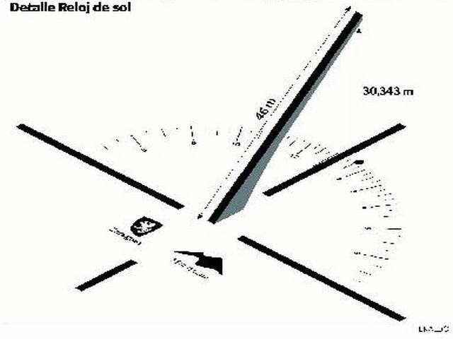 El elemento más destacado y fundamental de este reloj solar es su gran gnomon, realizado en acero corten oxidado, un mástil inclinado de 46 metros de longitud cuyo remate se ubica a casi 31 metros de altura. Su anchura es de 1 metro, mientras que su profundidad es variable, reduciéndose conforme gana altura, lo que contribuye a aligerarlo visualmente al otorgarle un aspecto estilizado, acentuado gracias a su depurado y sobrio diseño. Puede llegar a proyectar una sombra de más de 500 metros de longitud, y la punta de dicha sombra puede moverse en ciertos días a una velocidad de 7 metros por minuto, lo que hace que su movimiento sea visible a simple vista. La precisión de lectura del reloj es de unos 15 segundos, y está dotado para indicar con notable exactitud el signo zodiacal del momento y aproximadamente el día del año en que se está, así como para marcar, entre otras cosas, los cambios de estaciones, es decir, los equinoccios de primavera y otoño, y los solsticios de verano e invierno. Todos estos cálculos se pueden hacer de manera precisa gracias a la denominada Plaza del Reloj, que cuenta con un dial horario y símbolos astronómicos (un total de 3.000 marcas aproximadamente).
