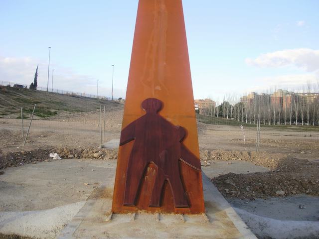 - 1) acero y hormigón (cimentación y base); 2) acero corten oxidado (el gnomon, la placa conmemorativa, el logotipo de Multicaja y el escudo de Zaragoza); 3) madera (la silueta esquemática de un adulto y un niño pegada a la cara frontal o sur del gnomon).