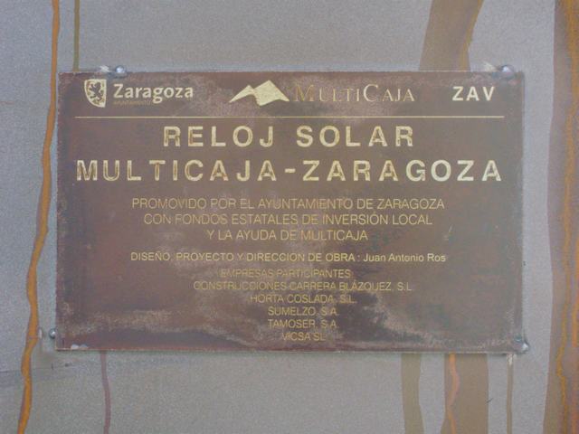 - 1) en una placa conmemorativa en acero corten soldada a la cara trasera o norte del gnomon: ZARAGOZA AYUNTAMIENTO MULTICAJA ZAV / RELOJ SOLAR / MULTICAJA-ZARAGOZA / PROMOVIDO POR EL AYUNTAMIENTO DE ZARAGOZA / CON FONDOS ESTATALES DE INVERSIÓN LOCAL / Y LA AYUDA DE MULTICAJA / DISEÑO, PROYECTO Y DIRECCIÓN DE OBRA: JUAN ANTONIO ROS / EMPRESAS PARTICIPANTES: / CONSTRUCCIONES CARRERA BLÁZQUEZ, S.L. / HORTA COSLADA, S.L. / SUMELZO, S.A. / TAMOSER, S.A. / VICSA, S.L.; 2) en letras recortadas de acero corten soldadas al lado oeste del gnomon, acompañando al logotipo corporativo: MULTICAJA; 3) en letras recortadas de acero corten soldadas al lado este del gnomon, acompañando al escudo de la ciudad: ZARAGOZA / AYUNTAMIENTO.