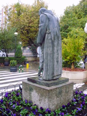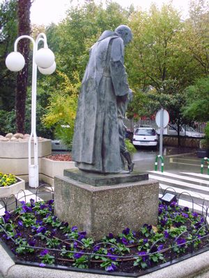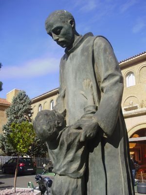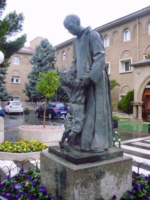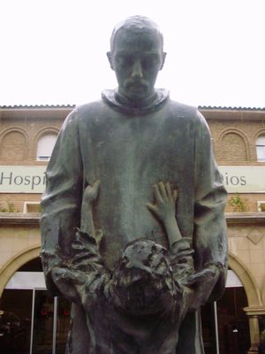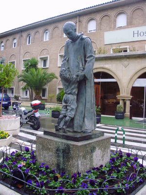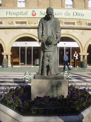 La escultura dedicada a San Juan de Dios preside los jardines del hospital del mismo nombre regentado por la Orden Hospitalaria de San Juan de Dios, ubicado junto al Canal Imperial de Aragón, en el Paseo de Colón nº 14 de Zaragoza, el cual, diseñado por el destacado arquitecto aragonés Santiago Lagunas, fue inaugurado como Clínica Abierta destinada a cubrir las necesidades asistenciales existentes en Zaragoza, sobre todo quirúrgicas y maternales (allí nacieron unos 30.000 zaragozanos), en 1953, y abierto al público en 1954. La escultura que nos ocupa se colocó mucho después, con posterioridad al 8 de marzo de 1979, en que se inauguró la primera y más importante fase de la remodelación integral del recinto asistencial, dirigida por los arquitectos Victoriano Arranz Pertierra y Pedro Campos Mondragón, que supuso su conversión en hospital, con la creación de sus servicios centrales y una plantilla médica propia (a partir de comienzos de 1981 pasó a complementar a la sanidad pública a través de diversos conciertos), fecha en la que todavía no existía.