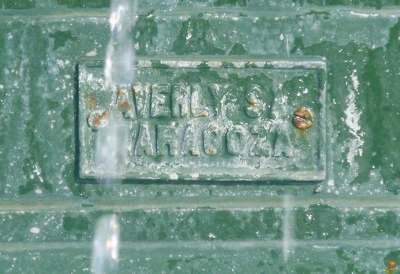 - Existen dos placas rectangulares iguales de hierro fundido atornilladas a la parte baja o pedestal del fuste de la fuente, una en la cara frontal y otra en la trasera, en las que con letras en relieve aparece el siguiente texto: AVERLY SA / ZARAGOZA.