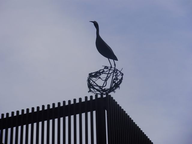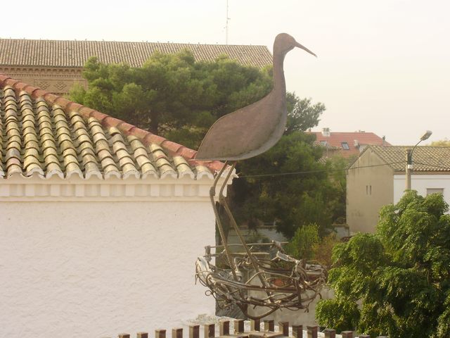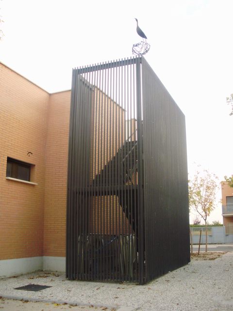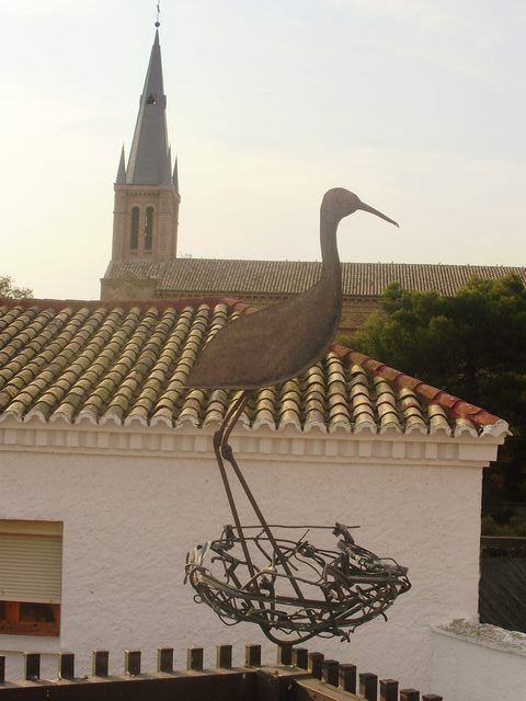 Concretamente, Jesús Guallar representó una cigüeña aposentada en un nido, cuyo cuerpo y cabeza está hecho mediante una simple chapa, solución que paradójicamente no resulta planista, ya que el artista envolvió dicha chapa por su parte inferior con otra dispuesta perpendicularmente y que sirve para sugerir el volumen de la panza o lomo del animal gracias a la incidencia de la luz que, por la disposición de la pieza en alto, suele deslumbrar ligeramente al espectador que la ve desde abajo, generando la percepción de que el cuerpo del ave tiene volumen real. Por su parte, las largas patas de la cigüeña están resueltas de manera muy lograda mediante barras de encofrado que, por su escaso diámetro y superficie rugosa, pero sobre todo por su disposición quebrada, como si estuvieran flexionadas (el artista sugirió la típica articulación de las rodillas propia de estas aves mediante puntos de soldadura), evocan de manera muy eficaz el aspecto de estas extremidades del animal. Dichas patas emergen del nido dispuesto debajo, que Guallar solucionó de manera muy efectista y lograda mediante un complejo entramado de barras de encofrado, varillas y perfiles metálicos.
