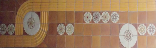 En un principio sus murales cerámicos eran más escultóricos, pero con el tiempo dejan de preocuparse por la calidad de las texturas, para tratar la cerámica como si se tratara del muro mismo. En este mural conjugan los símbolos geométricos abstractos como círculos blancos con símbolos de átomos en colores ocres, marrones y rojos, creando un diseño geométrico a partir de módulos que les ofrecen múltiples posibilidades según la posición en que se coloquen en el muro, en una conjunción perfecta entre el trabajo artesanal e industrial. De hecho en este mural se repiten las formas geométricas del mural de la Tienda del Real Zaragoza.