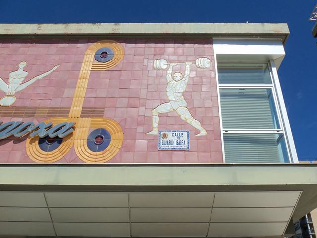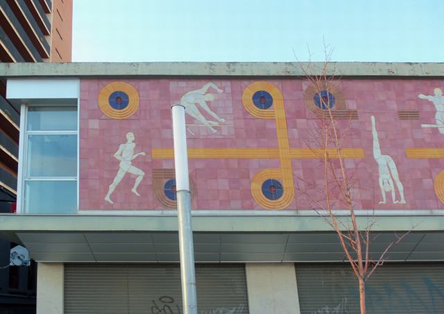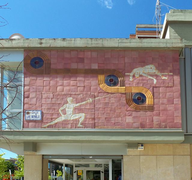 En este mural conjugan los símbolos geométricos abstractos, como círculos con radios cruzados en su interior -amarillos y azules-, con la representación figurada estilizada de distintos deportes que se podían practicar en el Pabellón Polideportivo. Los deportistas -hombres y mujeres- están representados en blanco, destacando enormemente sobre el fondo rosa del mural.