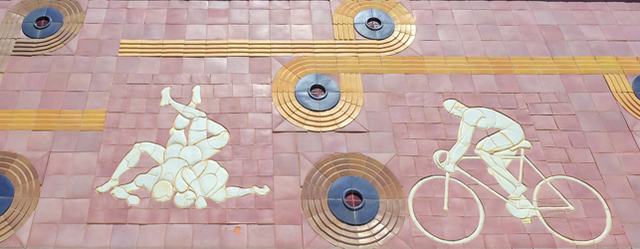 En la fachada N.O. figuran el fútbol y la natación. En la fachada N.E. la esgrima y el salto de altura. Y en la fachada principal, de izquierda a derecha: el atletismo, salto con pértiga, gimnasia deportiva -prueba de suelo-, carrera de obstáculos, lucha libre, ciclismo, gimnasia deportiva -prueba de potro-, boxeo, gimnasia deportiva -barra de equilibrios-, y levantamiento de pesas.