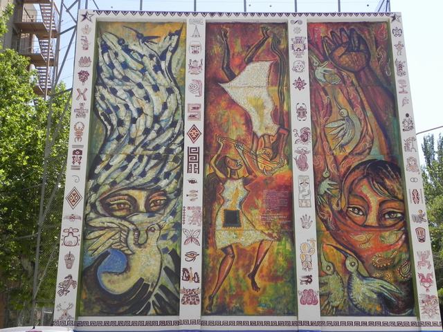 Ambas dirigen su mirada a la escena central, donde el paralelismo establecido entre la mujer palestina y la chiapaneca culmina en la representación de dos mujeres que, como símbolo del Norte y del Sur, danzan y se comunican entre sí para referirse al deseo de unión de la Humanidad. Toda la composición se acompaña de símbolos y motivos decorativos procedentes de diferentes culturas, principalmente de origen precolombino.
