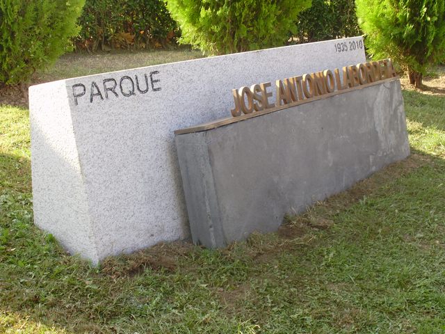 1) en letras de acero corten sobre el bloque de piedra delantero: JOSE ANTONIO LABORDETA; 2) en letras cinceladas y pintadas en el extremo izquierdo de la parte alta de la cara frontal del bloque de piedra trasero: PARQUE; y 3) en letras cinceladas y pintadas en el extremo derecho de la parte alta de la cara frontal del bloque de piedra trasero: 1935 2010.