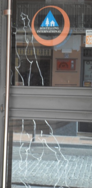 La silueta blanca delinea el contorno de un atlético personaje cabeza abajo, como si estuviera llegando al suelo tras lanzarse en algún ejercicio gimnástico o de danza. En el cristal inferior se han representado los brazos, cráneo y torso, que ocupan la mayor parte de la superficie. En el cristal superior la silueta queda a un lado, dejando en el centro el logo de la asociación internacional de albergues juveniles, y representa los pies y muslos de la figura. Queda obviada la parte central del cuerpo, que hemos de imaginar para dar continuidad al dibujo, en la franja central de la puerta que es opaca.
