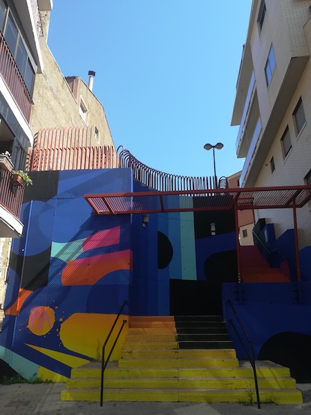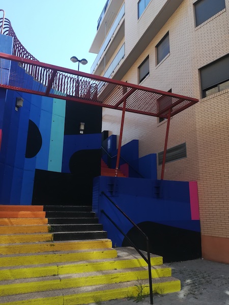 Asalto es el Festival Internacional de Arte Urbano nacido en 2005 en Zaragoza. En cada edición, trata de dinamizar y fomentar la sociabilidad de los barrios cuyo atractivo pretende realzar o redescubrir a través de diferentes actividades artísticas. La edición del año 2017 fue en Valdefierro, donde se intervino en los lugares más insospechados, como estas escaleras de comunicación directa entre calles y viviendas. El artista, Zest, diseñó una pintura de grandes dimensiones, contraponiendo colores cálidos (rojos, amarillos y magentas) y colores fríos (gama de azules), lo que consigue un contraste perfecto entre los distintos elementos constructivos, como los escalones, y los elementos decorativos, como los pasamanos o el enrejado que hace las funciones de tejadillo.