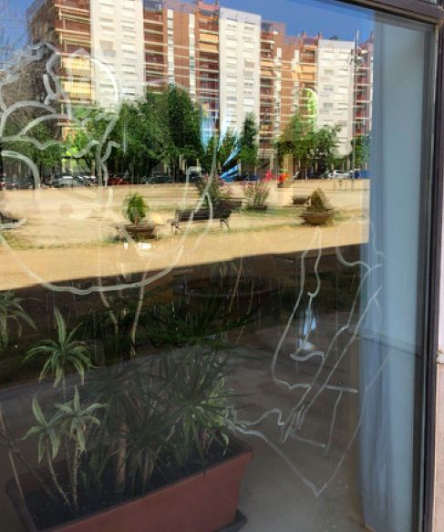 Surgió la idea de esta intervención tras la realización de un encargo para un taller intergeneracional en este edificio y la propia artista propuso incorporar la realización de la intervención en los cristales.