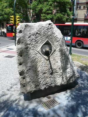 - "MIGUEL/SERVET"(en la parte frontal de la Fuente - Escultura)."TG/88"(ángulo inferior derecho de la parte frontal de la Fuente - Escultura).