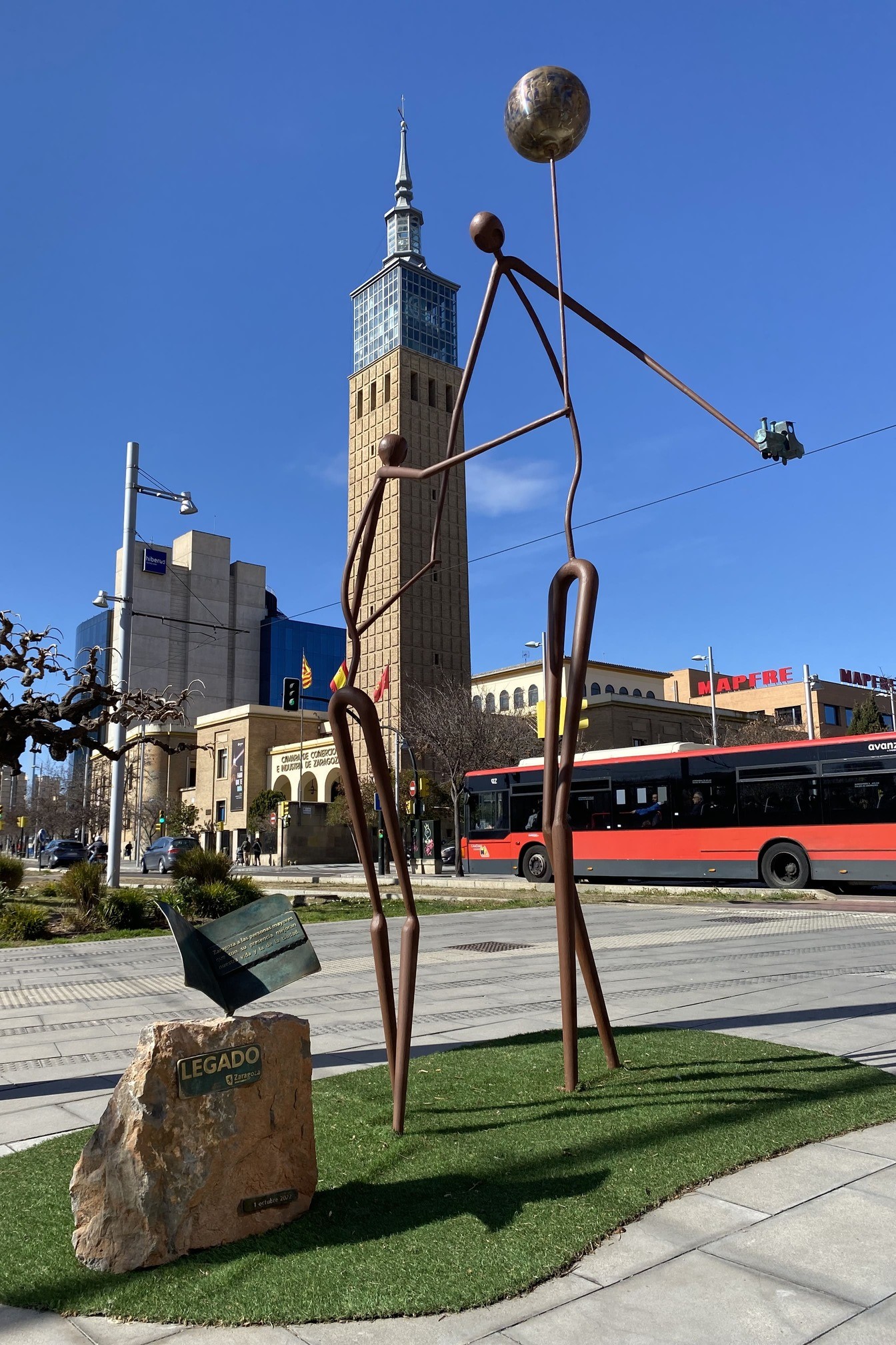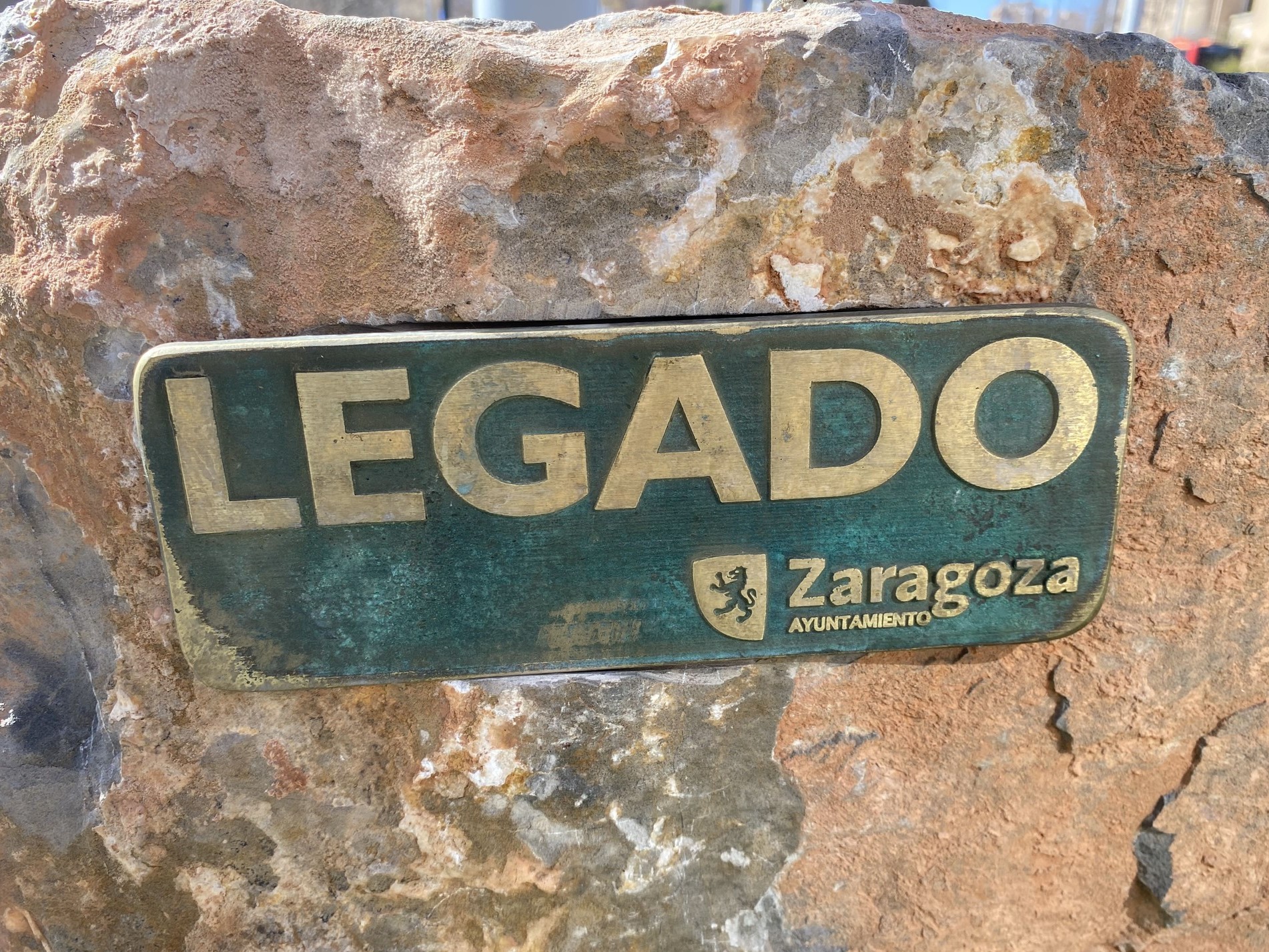 Primera placa de bronce de la parte frontal del pedestal pétreo: “LEGADO”, título de la obra, que se acompaña del logotipo del Ayuntamiento de Zaragoza.