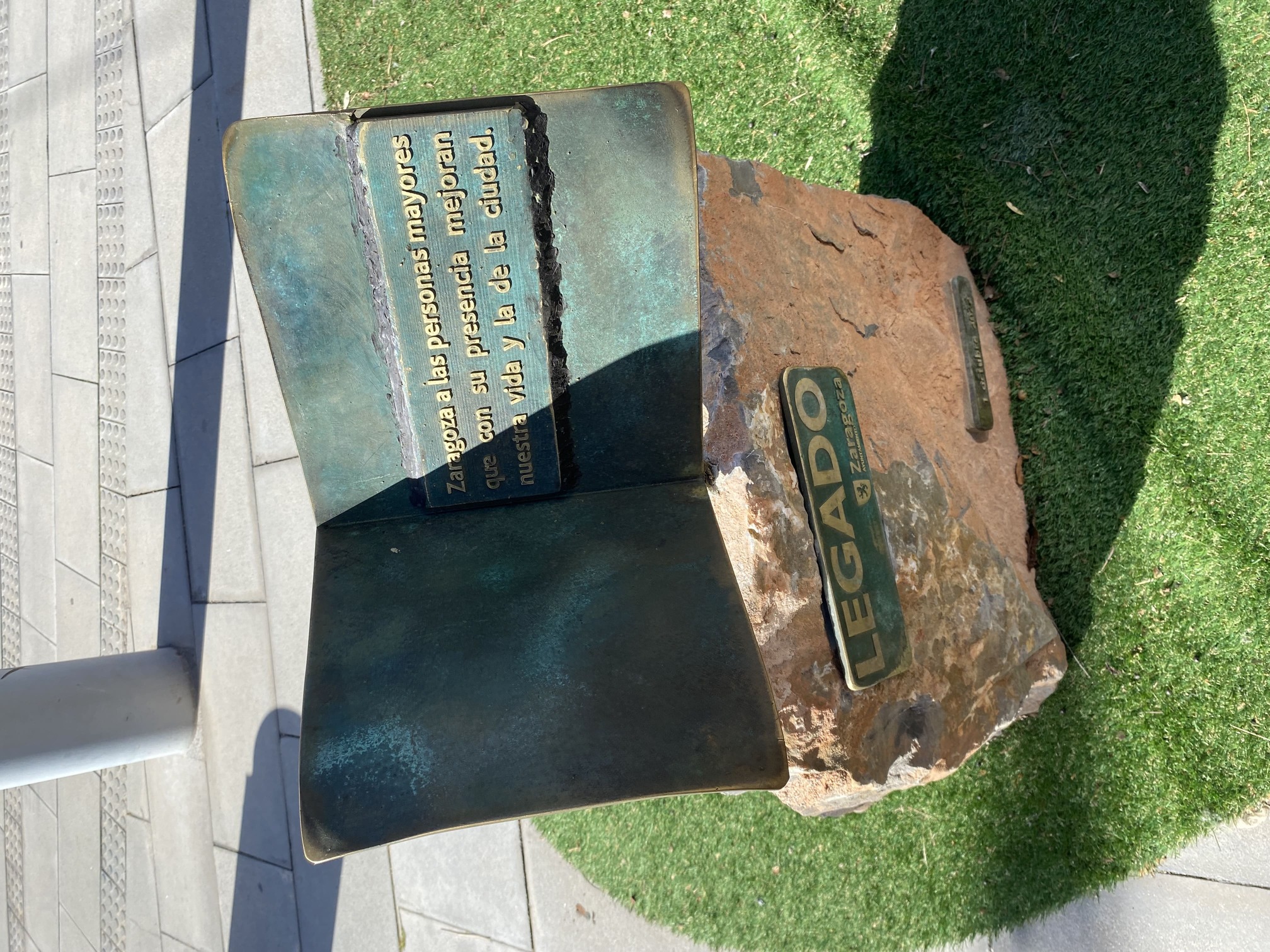 Libro abierto de bronce: “Zaragoza a las personas mayores / que con su presencia mejoran / nuestra vida y la de la ciudad.”.