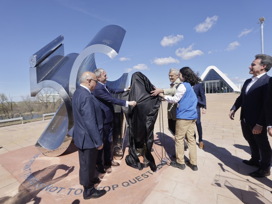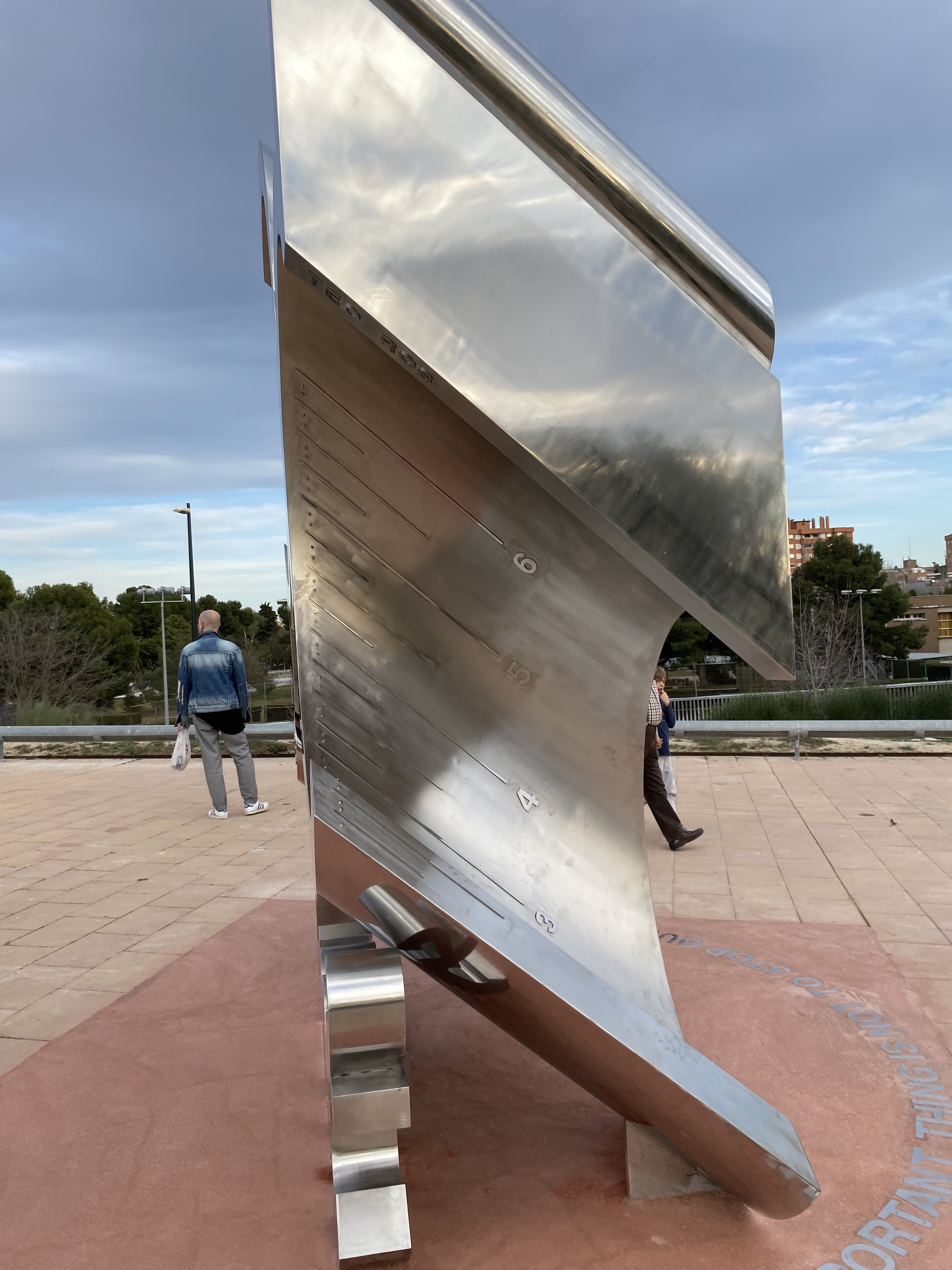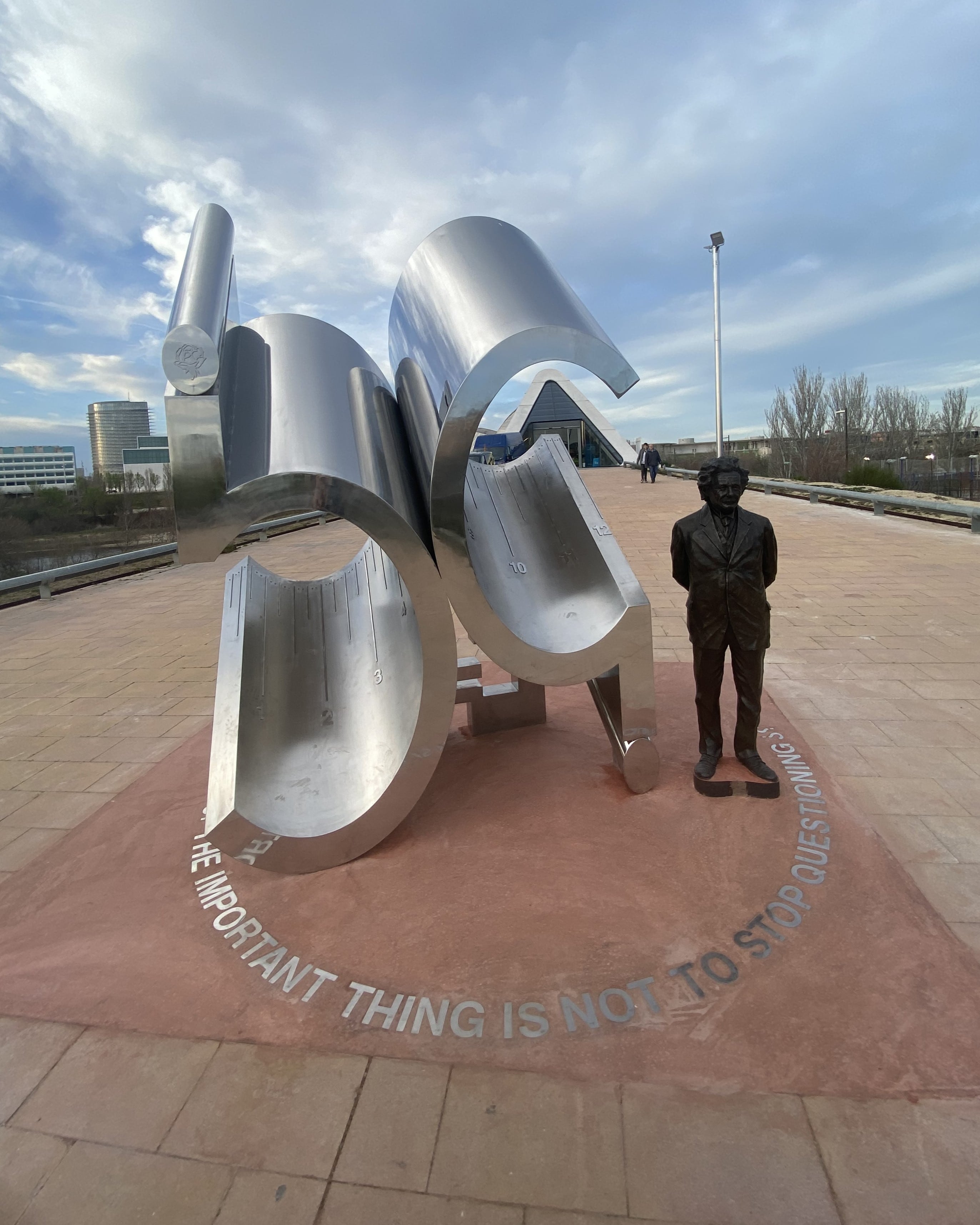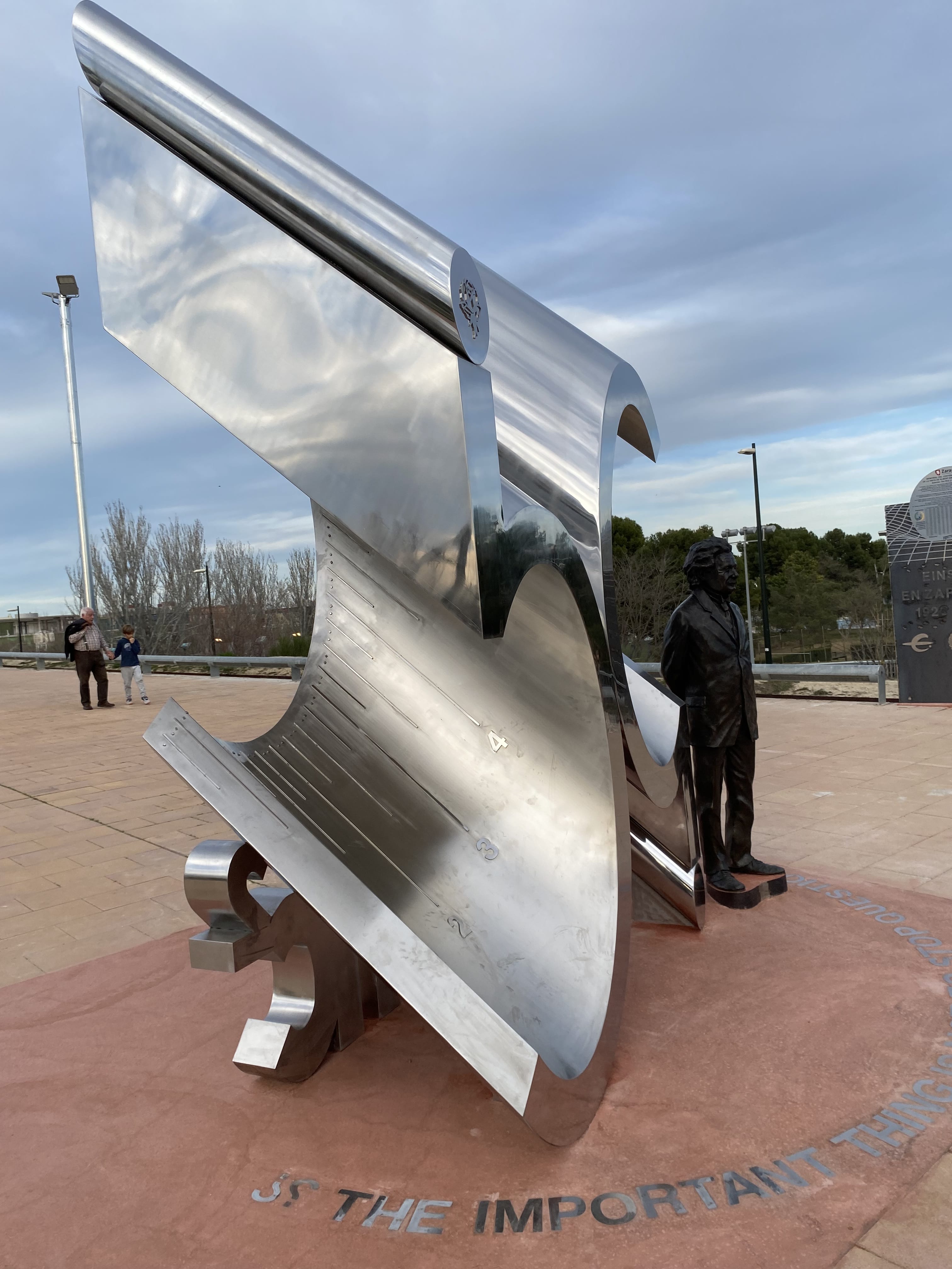En la base general de la obra, con letras mayúsculas de acero inoxidable integradas en el suelo formando un semicírculo, se incluye en inglés un célebre lema de Albert Einstein: “THE IMPORTANT THING IS NOT TO STOP QUESTIONING".