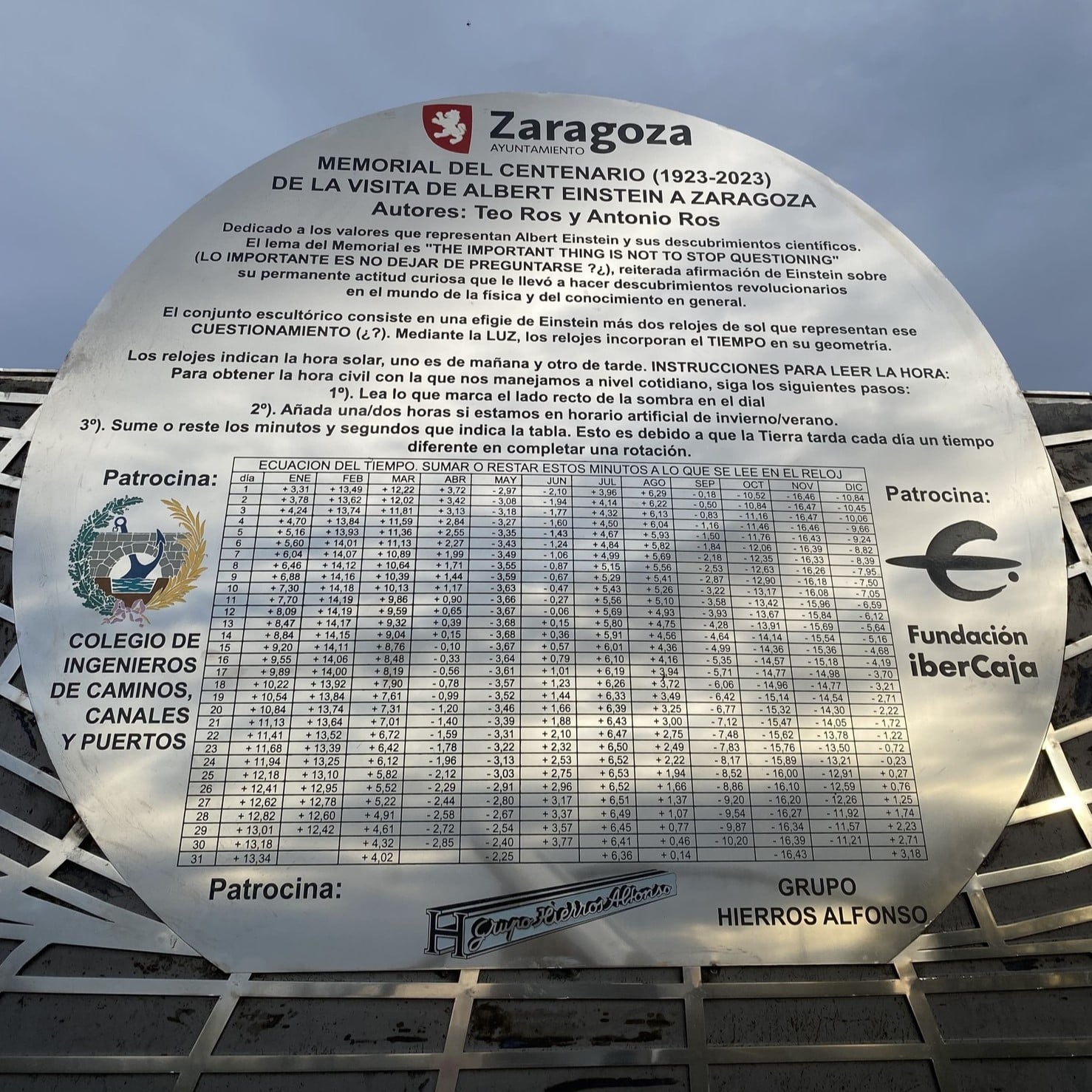 En el gran panel lateral que recoge la explicación del funcionamiento de los dos relojes solares se incluye, en grandes letras mayúsculas, bajo la representación gráfica de la Teoría de la Relatividad y sobre los logotipos de los promotores de la obra: “EINSTEIN / EN ZARAGOZA / 1923 2023”.