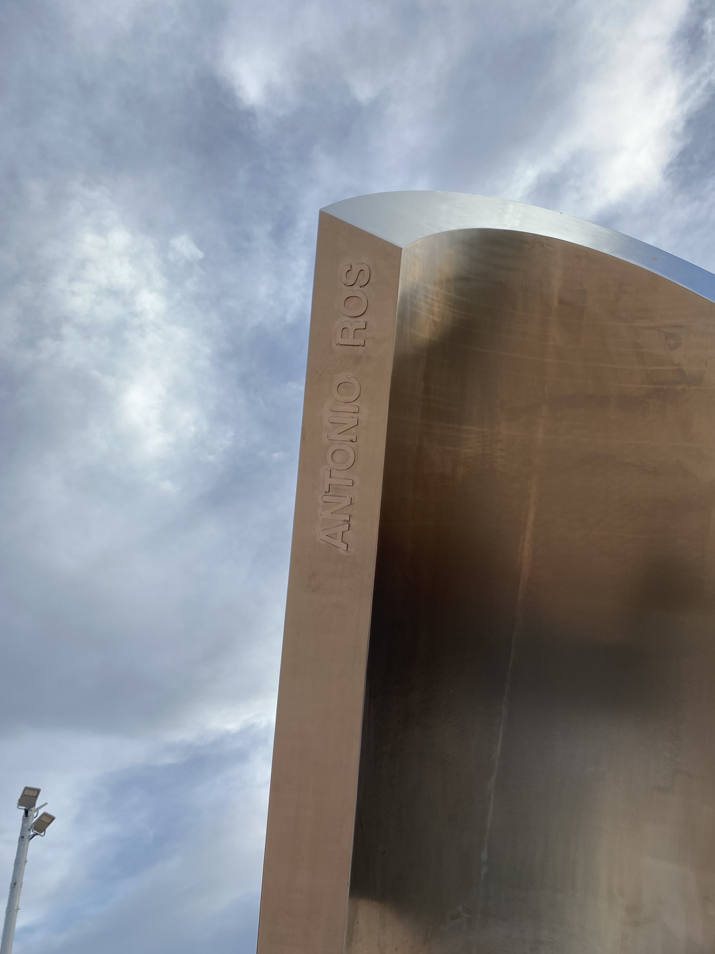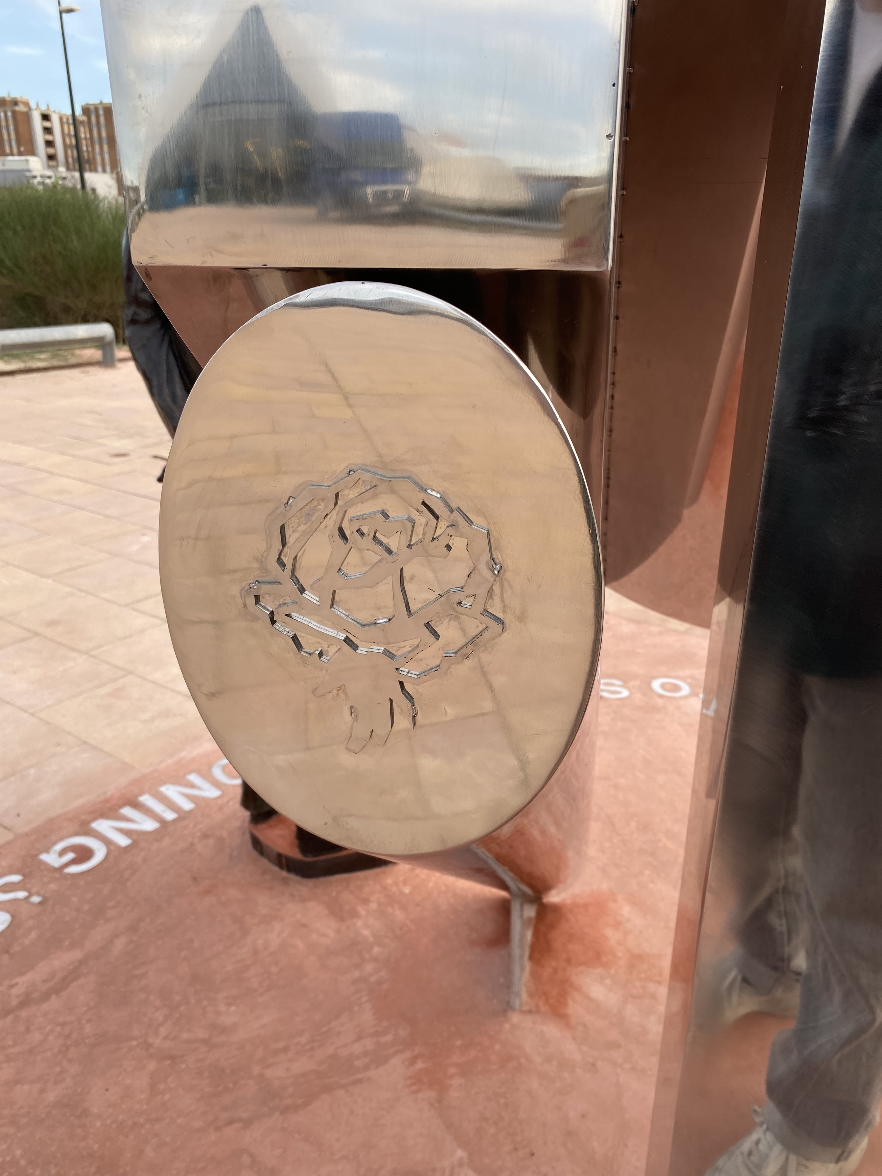 En el borde exterior derecho de los relojes solares se incluye, en letras mayúsculas recortadas de acero inoxidable, el nombre del diseñador general del conjunto: “ANTONIO ROS”, y en el izquierdo el de su hijo y colaborador en el diseño: “TEO ROS”. Ambos nombres se complementan, en el anverso y reverso de los relojes solares, con sendas rosas caladas de acero inoxidable, alusión simbólica al apellido Ros que suele estar presente en todas las obras de Juan Antonio Ros.