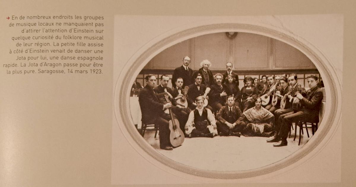 El célebre físico alemán Albert Einstein visitó España entre febrero y marzo de 1923 e impartió conferencias en las ciudades de Barcelona, Zaragoza y Madrid. Llegó en tren a Zaragoza, procedente de Madrid, el lunes 12 de marzo de 1923, con el fin de impartir dos conferencias en la Universidad de Zaragoza, concretamente en el aula magna de la Facultad de Medicina y Ciencias (actual edificio Paraninfo), los días 13 y 14 de marzo. La visita, que duró poco más de 48 horas, fue todo un acontecimiento que revolucionó la ciudad. A su llegada le fueron a recibir el profesor Antonio de Gregorio y Rocasolano, por cuyas investigaciones bioquímicas se interesó Einstein, el cónsul de Alemania en la ciudad y reputado fotógrafo, Gustavo Freudenthal, estudiantes, súbditos alemanes y algunas autoridades. Aunque pocas personas entendían muy bien lo que había descubierto, Einstein era una celebridad y todo el mundo lo reconocía por la calle. Durante su estancia zaragozana, el miércoles 14 de marzo de 1923, en un salón del Hotel Universo y de las Cuatro Naciones, en la calle Don Jaime I 32, donde estaba alojado con su mujer Elsa, Einstein fue agasajado con una sencilla fiesta de despedida que sirvió para celebrar su 44 cumpleaños, que era ese día. La misma estuvo amenizada por una rondalla jotera que le dejó muy impresionado y en compañía de la cual se llegó a fotografiar.