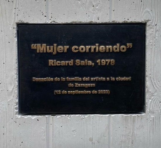 “‘Mujer corriendo’/ Ricard Sala, 1978/ Donación de la familia del artista a la ciudad/ de Zaragoza/ (12 de septiembre de 2023)” (cartela en la peana de hormigón)