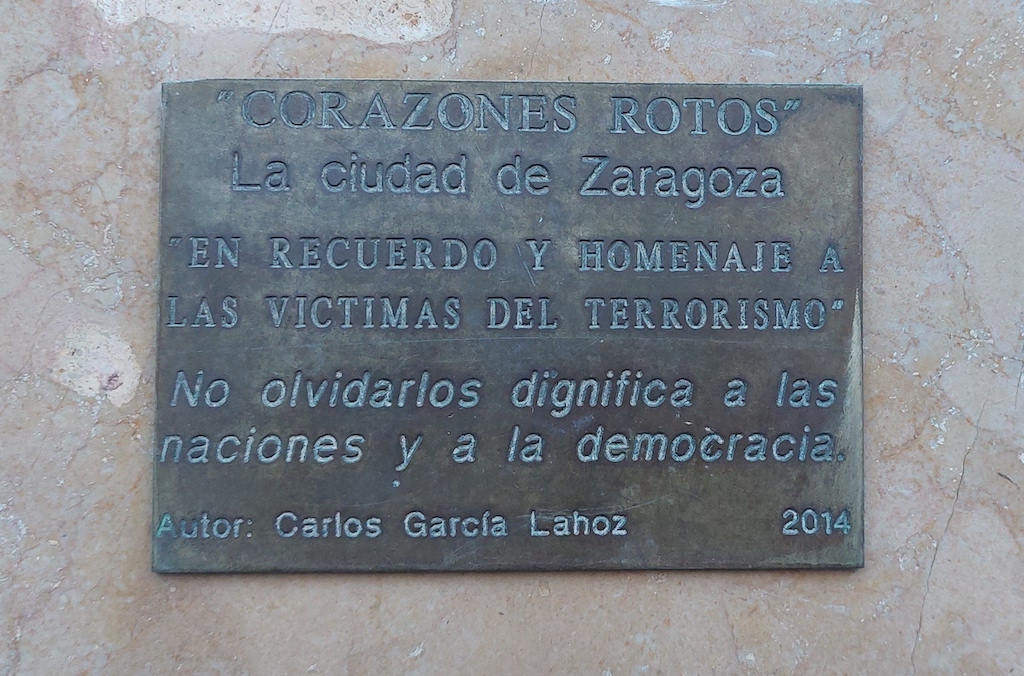 - Placa adjunta: “CORAZONES ROTOS/ La ciudad de Zaragoza/ EN RECUERO Y HOMENAJE A/ LAS VÍCTIMAS DEL TERRORISMO/No olvidarlos dignifica a las/ naciones y a la democracia./ Autor: Carlos García Lahoz 2014”.