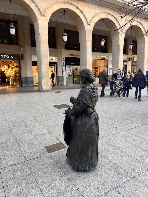 Hay una placa a los pies de la escultura con la siguiente inscripción: “Vendedora de Heraldo de Aragón La Castellana. Obra realizada por Anaga Sánchez Dieppa e inspirada en una fotografía por Aurelio Grasa el 12 de octubre de 1915. Escultura conmemorativa del 130 aniversario de HERALDO DE ARAGÓN (1895-2025)”.