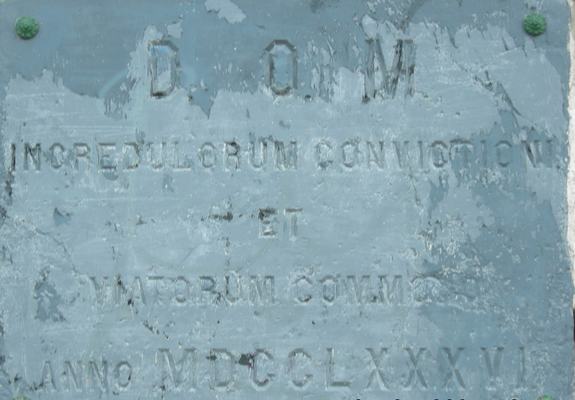 Placa de bronce con la dedicatoria"para convencimiento de los incrédulos y utilidad de los caminantes" escrita en latín: