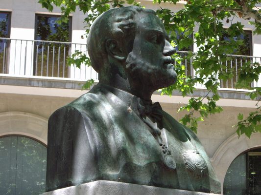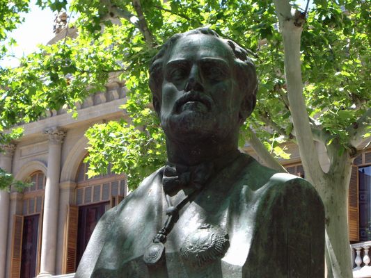El monumento, situado simétricamente de los otros tres que ya existían en la plaza, consta de un pedestal prismático de piedra, formado por dos bloques de desigual tamaño, el inferior o zócalo, más bajo y ancho. Sobre él, el busto-retrato del personaje en bronce, de concepción realista, está modelado con minuciosidad. El personaje viste toga y camisa con pajarita, lleva medalla y placa de magistrado. La cabeza, ligeramente ladeada hacia la derecha, tiene las facciones del rostro bien definidas, propias de un hombre de mediana edad -murió a la edad de 52 años- lleva barba y poblado bigote. El gesto es serio, altivo, desprende autoridad, tras la mirada intensa y concentrada. El recuerdo con los retratos romanos clásicos es inevitable, como en ellos, el rostro es la crónica de una vida y la descripción de la personalidad del retratado.