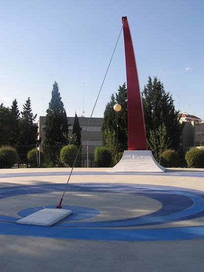 Normalmente los relojes de sol tienen clavado un vástago cuya sombra va moviéndose a lo largo del día; pero en este caso se trata de un cable sujeto a lo alto de un mástil curvo de hierro cuya silueta de lejos evoca la mitad superior de un arco en tensión. Un diseño muy ingenieril, minimalista, aunque pintado con vivos rojos y azules, complementarios del verde de la vegetación que lo rodea formando un intenso contraste con los colores planos y formas geométricas de este reloj.