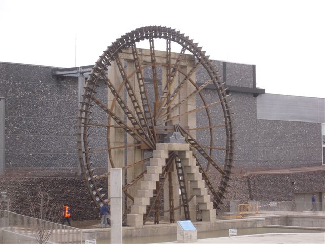 En el Parque del Agua Luis Buñuel, junto al Edificio Cabecera, sobre cuya cubierta vierte sus aguas el canal, creando una cortina de agua.