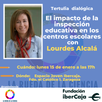 Tertulias Dialógicas Docentes con Lourdes Alcalá: ¿Cómo es la labor de la inspección educativa en los centros escolares? ¿Qué impacto tiene? ¿Cómo es en otros países? Lourdes Alcalá, Inspectora del Departamento de Educación en Teruel, doctora en Historia de la Educación y profesora asociada en la Universidad de Zaragoza nos ayudará a resolver estas cuestiones. Además, podremos debatir e intercambiar opiniones en la tertulia posterior.