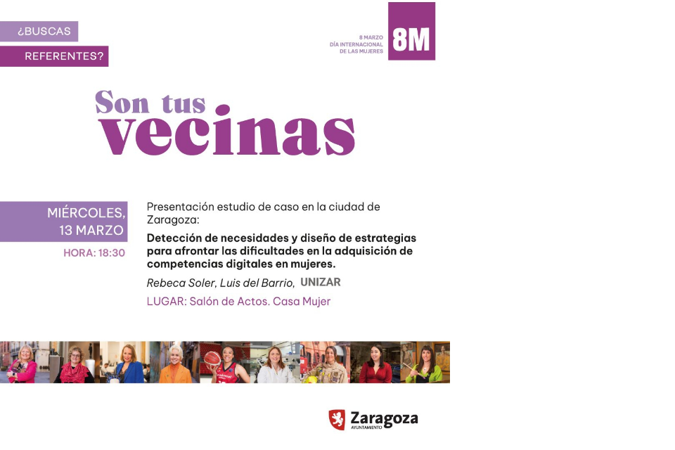 Dentro de la programación de actividades con motivo de la celebración del 8M se realiza la presentación estudio de caso en la ciudad de Zaragoza: Detección de necesidades y diseño de estrategias para afrontar las dificultades en la adquisición de competencias digitales en mujeres.