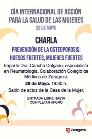 Charla dentro de la campaña del 28 de Mayo Día Iternacional de acción por la salud de las mujeres, que será impartida por la Dra. Concha Delgado, especialista en Reumatología, gracias a la colaboración del Colegio Oficial de Médicos de Zaragoza