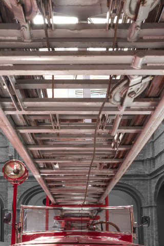 En el privilegiado espacio de un claustro construido hace casi quinientos años se exponen carros-bomba, carros-escalera, camiones bomba y autoescalas que han utilizado los bomberos en los últimos ciento cincuenta años. Al interés de la propia colección se suma la belleza de la combinación de ladrillo, metal, arcos, faros...